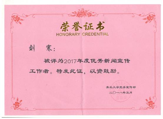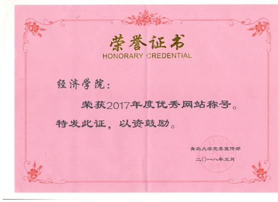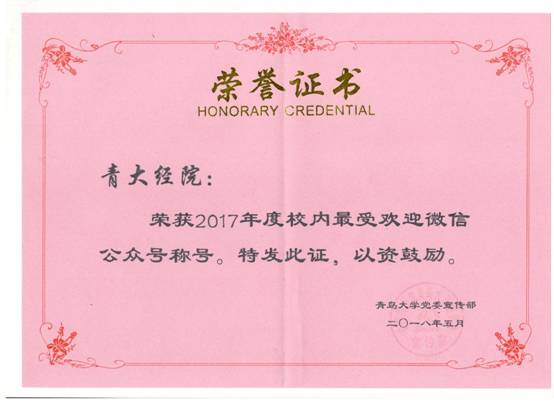 荣获校2017年度新闻宣传工作先进单位,学院网站被评为学校2017年度优秀网站,“青大经院”微信公众号被评为2017年度校内最受欢迎微信公众号,刘寒同志被评为2017年度优秀新闻宣传工作者。