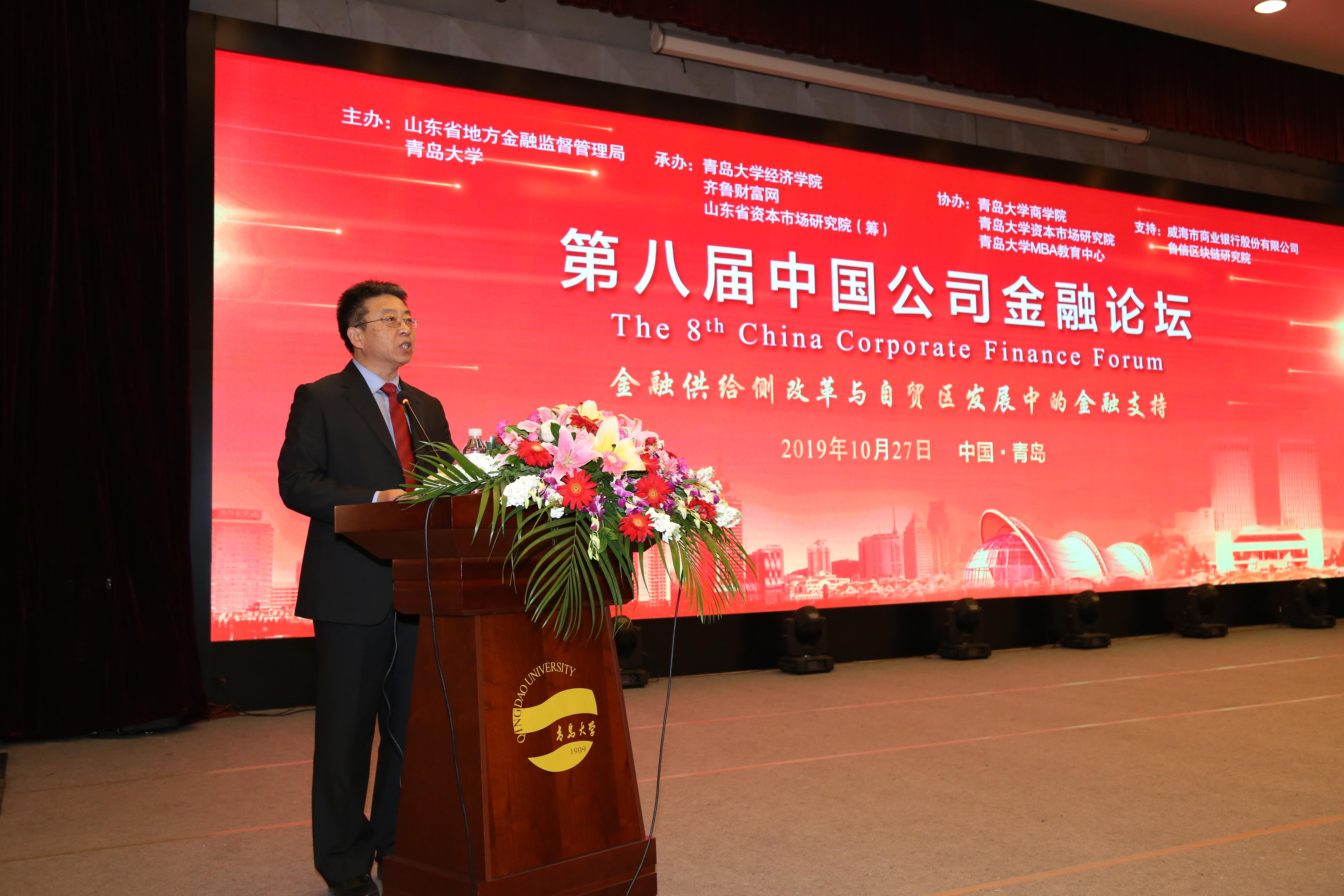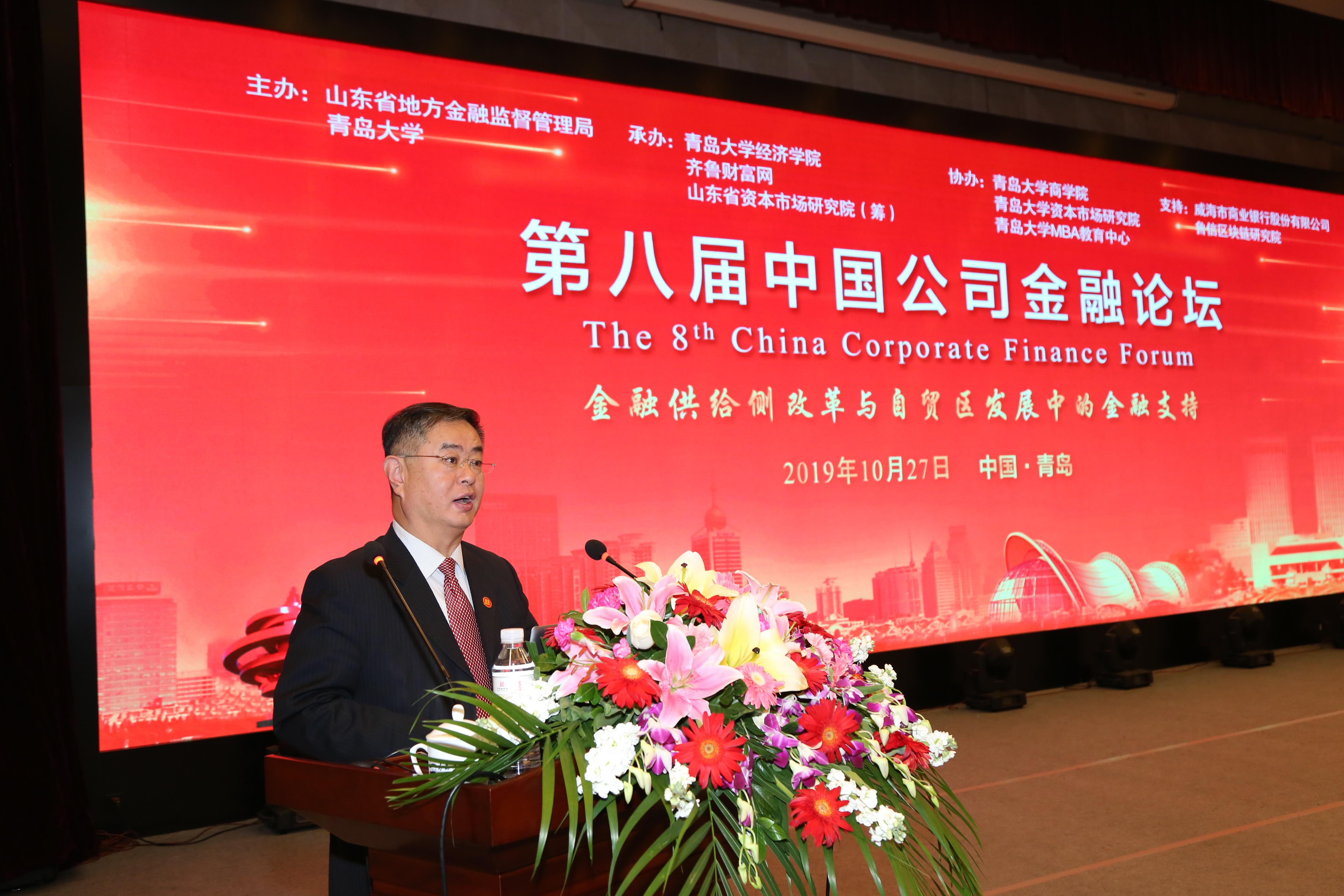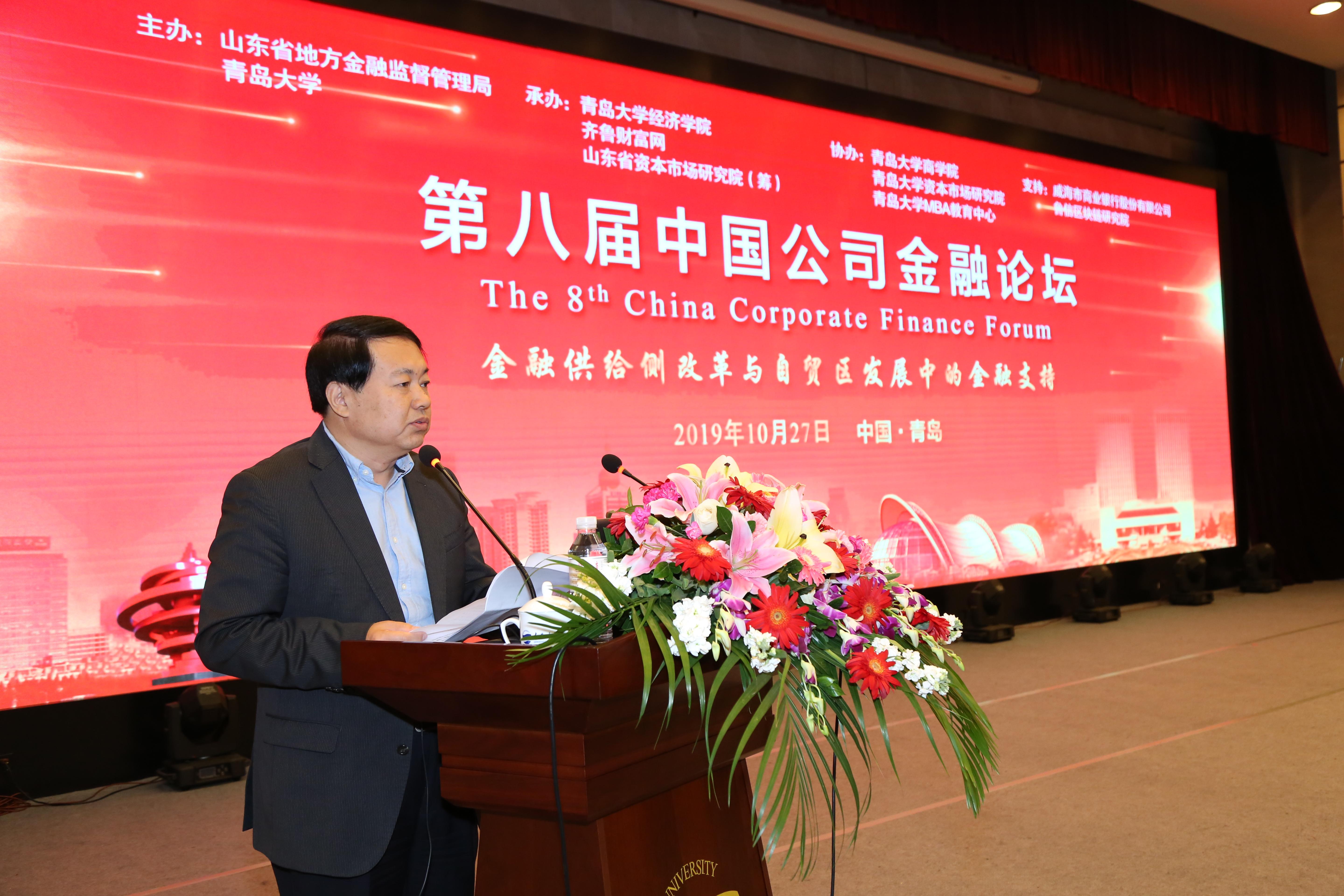 山东省地方金融监管局王继东介绍了山东省金融业的发展情况。王继东认为,第八届中国公司金融论坛的举办,恰逢中国(山东)自由贸易试验区获得国务院批准,并且以金融供给侧改革与自贸区建设中的金融支持为主题,更具特殊意义。对于金融业发展,王继东认为近年来山东省金融业保持了持续健康发展的良好势头。2019年上半年,全省金融业增加值2215亿元,同比增长7.7%,高于同期GDP增速2、3个百分点,占地方总值提高0.27个百分点。9月末全省社会融资规模余额达到12.3万亿元,同比增长12.3%,高于全国平均水平1.5个百分点,存贷款规模10.5和8.6万亿,746.1,债券3927.7亿元,收入2656亿元。另外,王继东表示,作为地方金融监管部门,作为防范化解金融风险的牵头部门,在具体实践中遇到很多问题,存在很大困惑。比如在社会融资规模快增长、房地产融资紧缩的大背景下,制造业企业仍感融资难、纷纷喊渴,资金到底去哪了?我们不搞大水漫灌,强调精准滴灌,但银行机构对部分行业、企业货款仍在搞一刀切,如何解决?在经济上行期,企业间互保、联保为增信融资发挥了积极作用,但在经济下行期,又成为放大风险、传播风险的“死亡链条”,应如何有效的破圈断链?在国家金融开放的整体框架下,地方与有关国家,如山东与日、韩金融互惠合作能否进行更广城、更深层次的探索等等,都需要权威的指导。