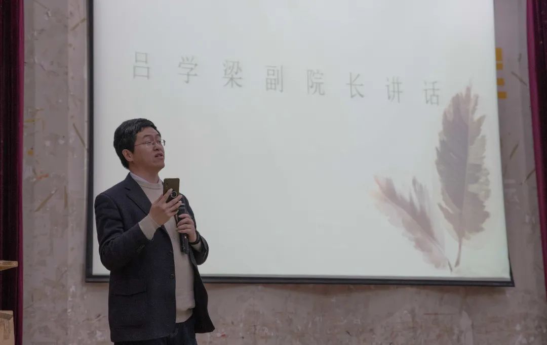 吕学梁老师致辞。吕学梁老师首先对“互联网+”和“大创”做简单介绍,勉励同学们要利用好这一载体。最后为同学们提出参赛建议,鼓励同学们积极参赛、展现风采。同学们表示深受鼓舞。