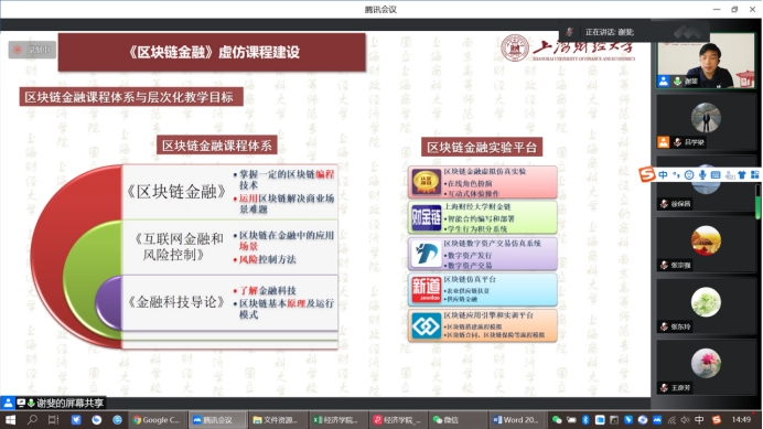 谢斐副主任从全校实验体系搭建者和国家级“金课”建设者两个角度,先后介绍了国家级虚拟仿真一流课程申报动向、《区块链金融》虚仿课程建设经验、国家级虚仿一流课程申报历程、上财虚拟仿真课程群和虚仿课程平台建设现状等多方面的内容。谢斐副主任的报告精彩纷呈,既有顶层设计的逻辑思考,又有课程建设的实践细节,既有对经验的系统总结,又有对未来的科学规划,引发了参会者的强烈共鸣和热烈讨论,使大家受益匪浅。