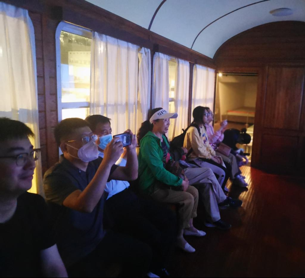 为了让参观者更加沉浸的体会到当时情形,除了一些极具历史意义的文物,青岛一战遗址博物馆还利用先进的投影和声光技术,最大限度地还原第一次世界大战时的景象。其中比较有特点的就是青岛一战遗址博物馆将胶济铁路的18个重要站点利用影像技术一一还原,同学们坐在按情景还原的车厢内,恍若隔世。