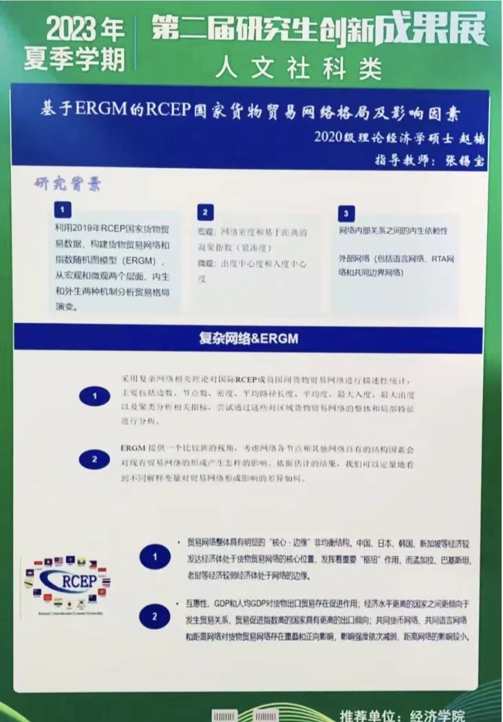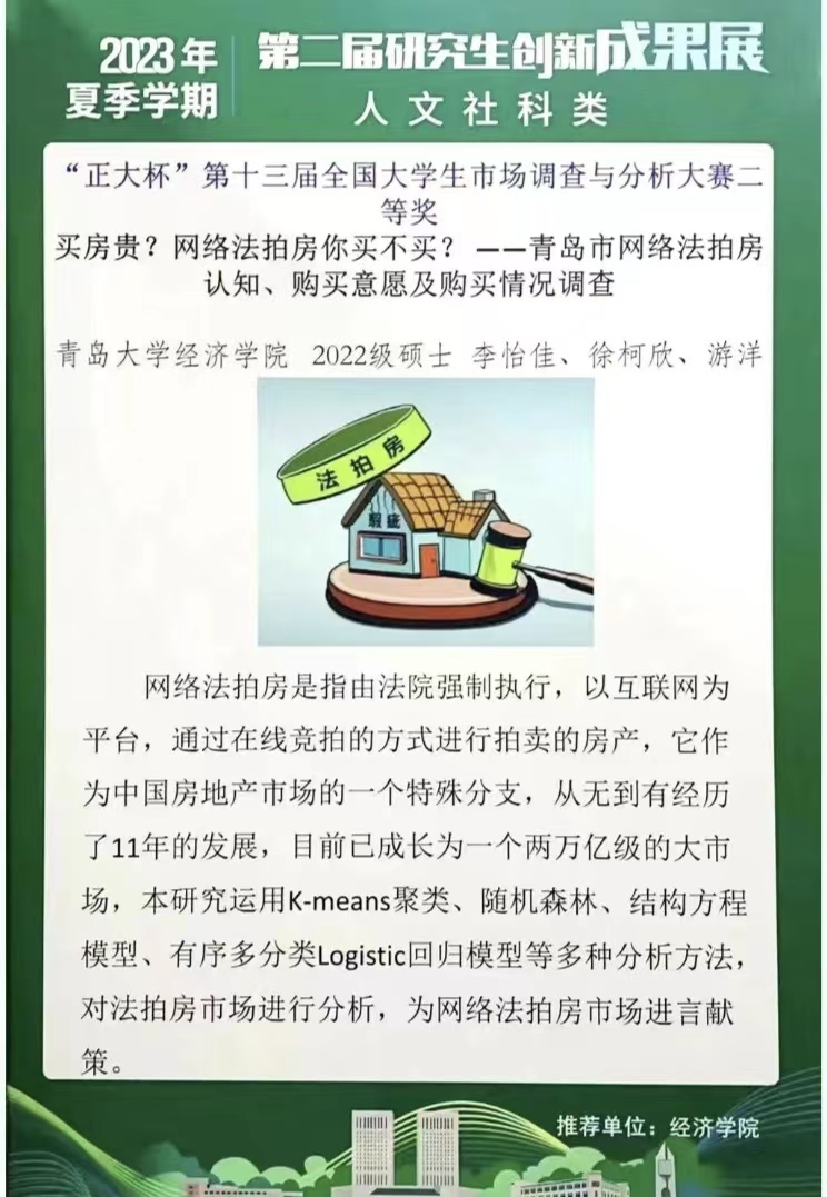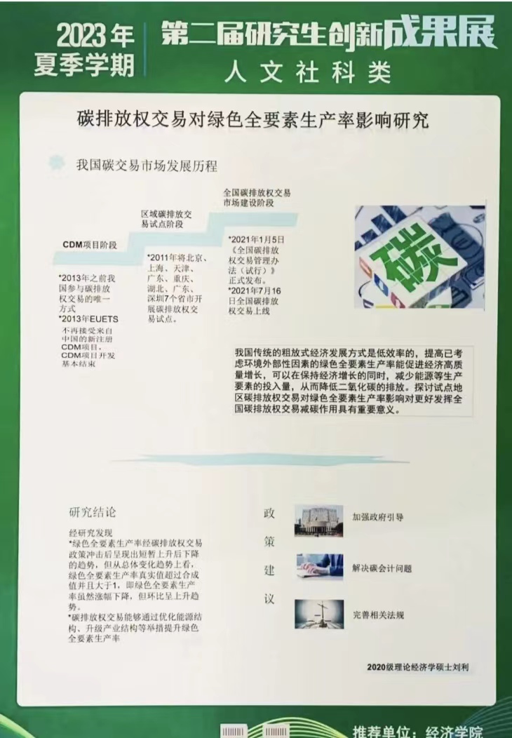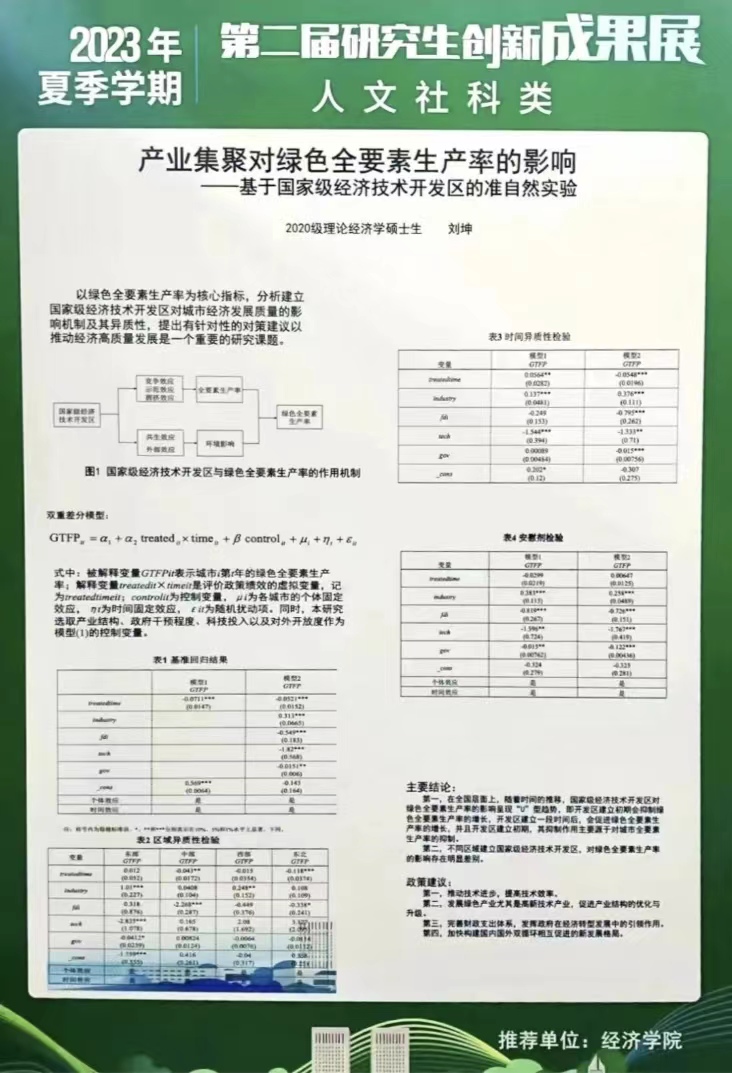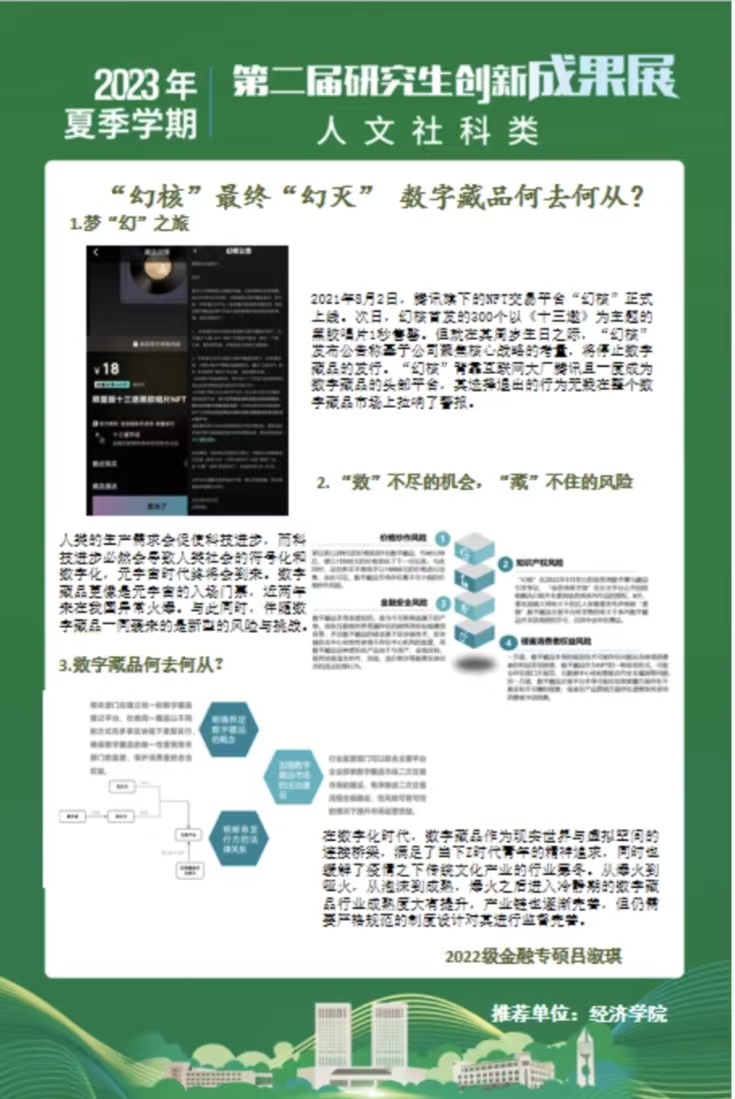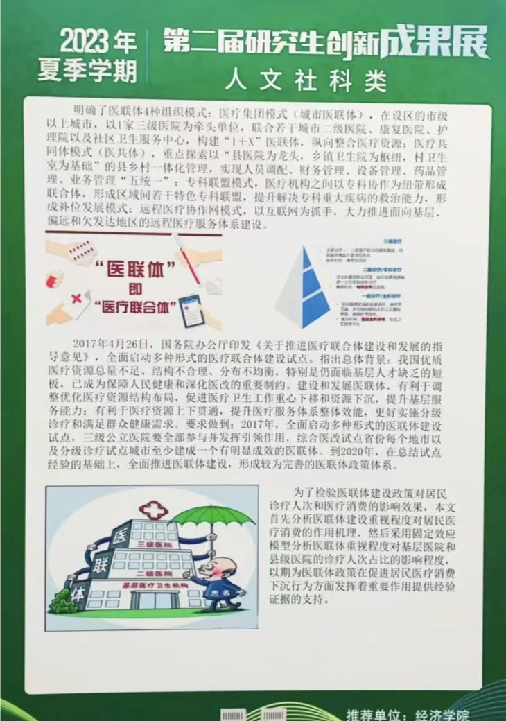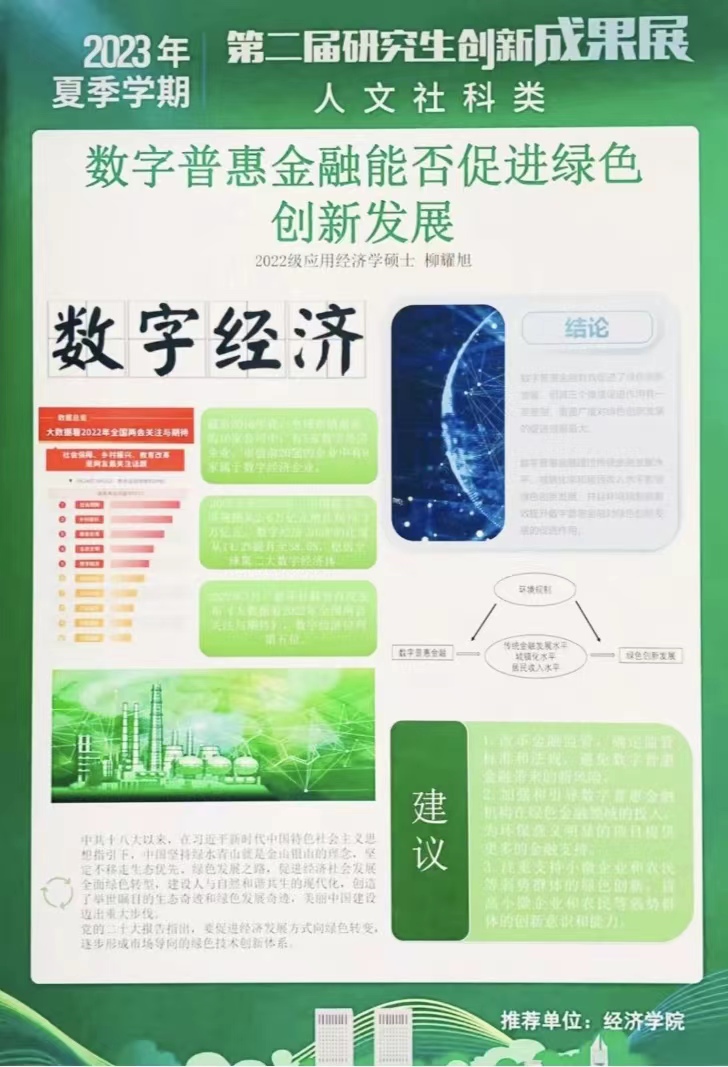 研究生20余项代表性创新成果中评出了“校优秀学术海报奖”和“院优秀学术海报奖”。其中,《长期护理保险对中老年人心理健康的影响》和《基于中介效应模型的地区财富对绿色技术创新影响研究》获评校优秀学术海报奖,《数字普惠金融能否促进绿色创新发展》等19个成果获评院优秀学术海报奖。让我们一睹思想碰撞的火花。