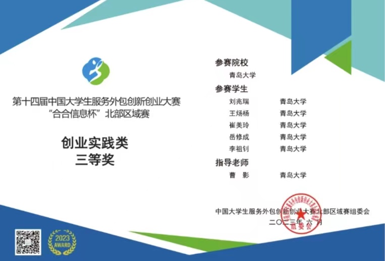 由曹影老师指导的学生团队荣获“创新实践类项目”三等奖。