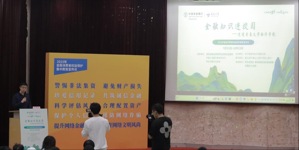 农行市北二支行运营部经理邓祯与农行八大关支行行长丛隽采用互动授课方式,为同学们讲解校园贷的特点和风险,常见电信诈骗的手段以及防范措施。他们结合金融消费者权益保护案例,提醒同学们用金融知识武装头脑,提高金融安全意识,培养良好的消费习惯。现场同学积极参与互动环节,同学们纷纷表示受益颇多。活动在中国农业银行与吃瓜网