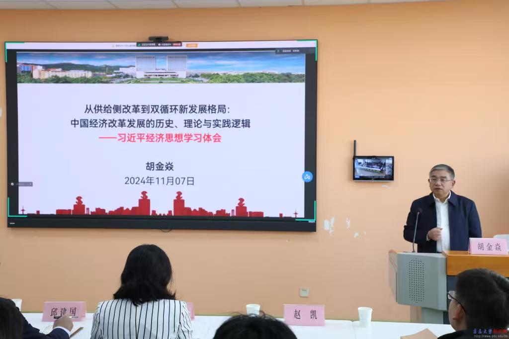 胡金焱以“从供给侧改革到双循环新发展格局:中国经济改革发展的历史、理论与实践逻辑——习近平经济思想学习体会”为题,从十三个方面阐释习近平新时代中国特色社会主义经济思想的丰富内涵,主要围绕“供给侧改革”“经济循环”两个方面展开详细讲解。一是从需求侧到供给侧:经济高质量发展的历史与实践逻辑,以及需求侧改革主导下的我国经济崛起和供给侧结构性改革为主线的经济高质量发展。二是从内、外循环到“双循环”:构建新发展格局的理论与实践逻辑,分别是从沿海开放到国际大循环经济发展战略、双循环新发展格局理论和双循环新发展格局的实践成效。