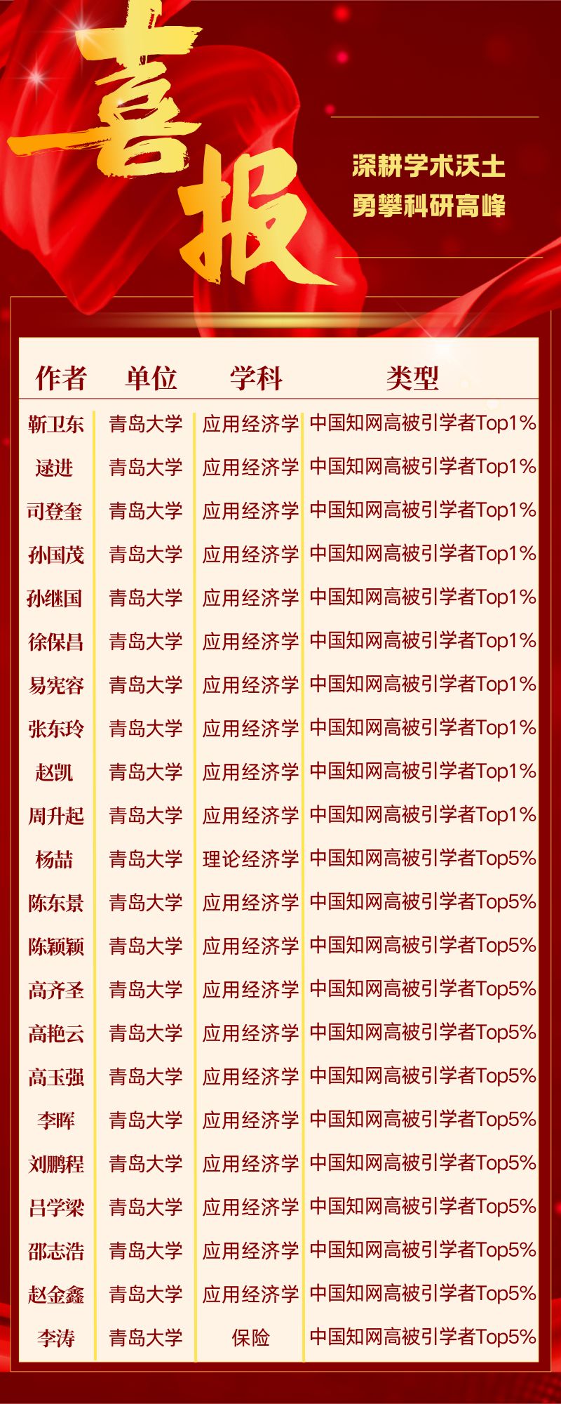 成绩斐然,共有22位教师脱颖而出。其中,靳卫东、逯进、司登奎等10位教师成功入选中国知网高被引学者Top1%,杨喆、陈东景、陈颖颖等12位教师同样表现亮眼,入选中国知网高被引学者Top5%,充分展现了学院在学术研究领域的学术影响力。