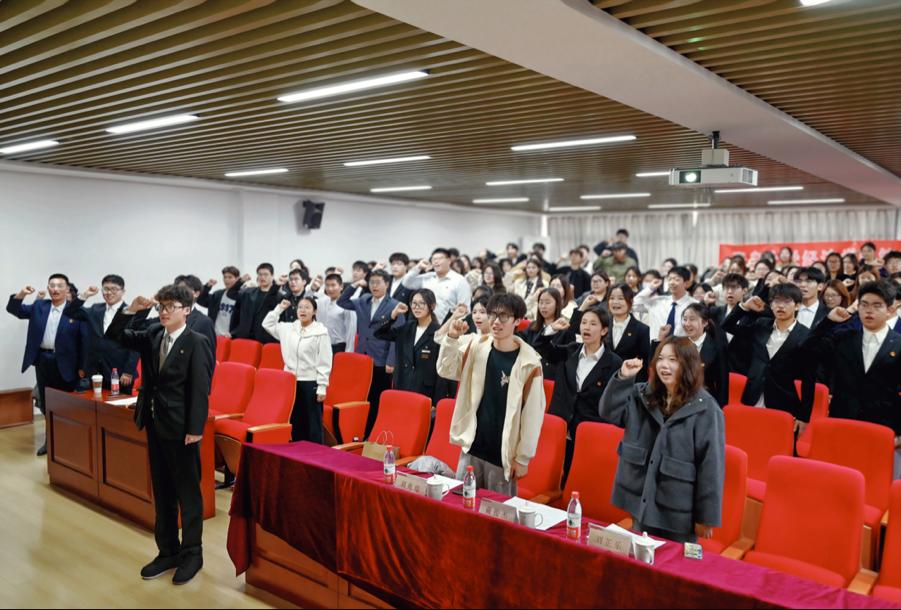 团委书记李鹏致辞。李鹏在致辞中指出,学生干部是从学生中选拔出来的骨干力量,是学校和学生之间的桥梁与纽带,是加强和改进思想政治教育的可靠力量。同时,他向学生干部提出了以下四点建议:第一“学”是学生干部的职责,要重视政治理论、专业知识学习,坚定理想信念,提高自身综合素质;第二“生”是学生干部的精神风貌,要有我要当的信念,不是要我当的杂念,收获共同成长的价值感;第三“干”是学生干部价值的基石,要有真情实干、踏实肯干、担当肯干的担当;第四“部”是学生干部的基础,要打牢学生组织机构基础,着眼于学生组织发展需要,释放创新创造的内生动力。新时代的学生干部要全面把握学生工作的内涵与路径,真正形成政治自觉、思想自觉和行为自觉,才能不忘初心,继续前行,书写清澈、干净、担当的生动实践。