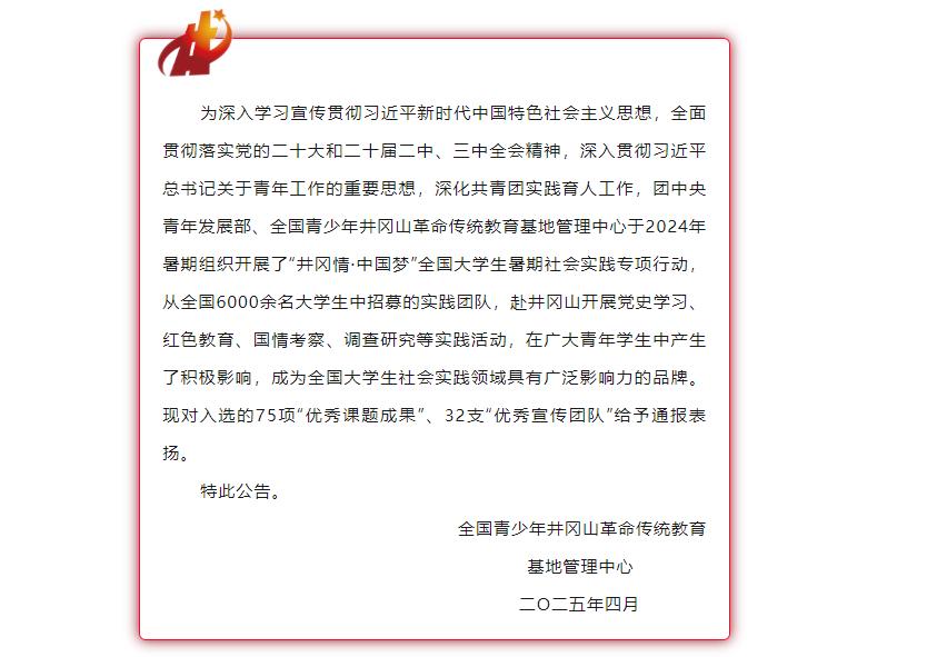 党委副书记于文洁、辅导员程漫漫指导的“星火传承调研团”成功入选2024年“井冈情·中国梦”全国大学生暑期社会实践专项行动优秀课题成果!