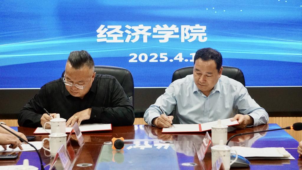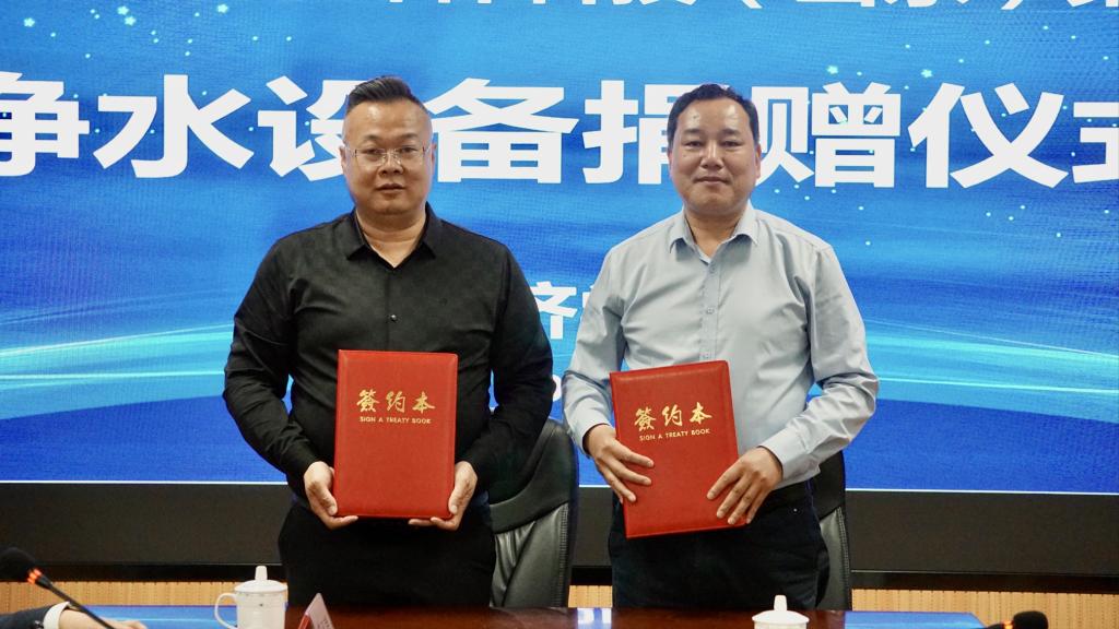 党委书记邱建国与乾泰环保科技(山东)集团有限公司董事长肖安平签订捐赠协议,并为捐赠企业颁发捐赠证书。