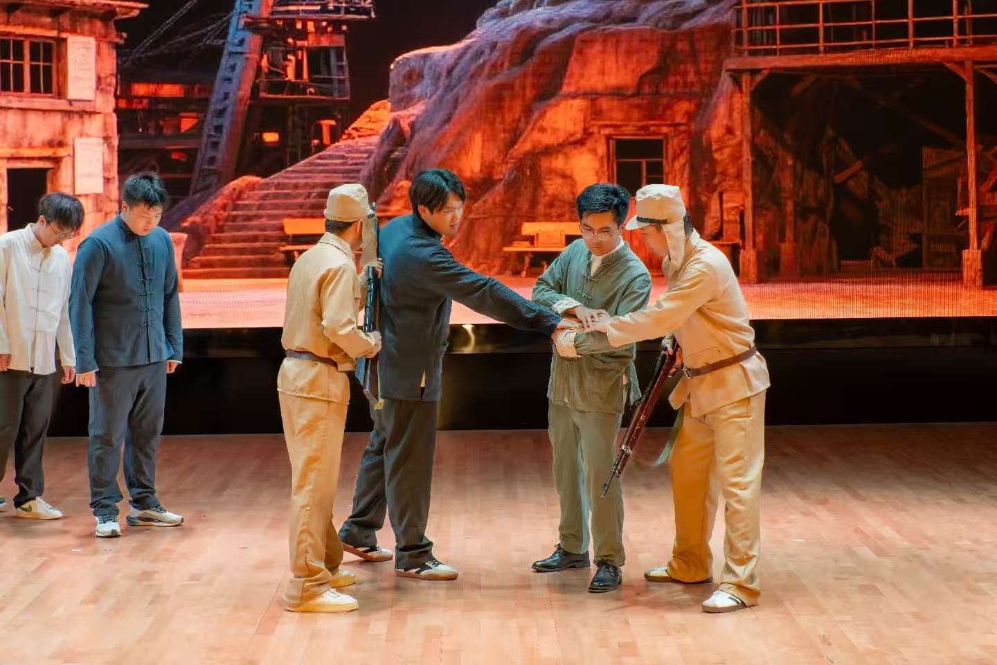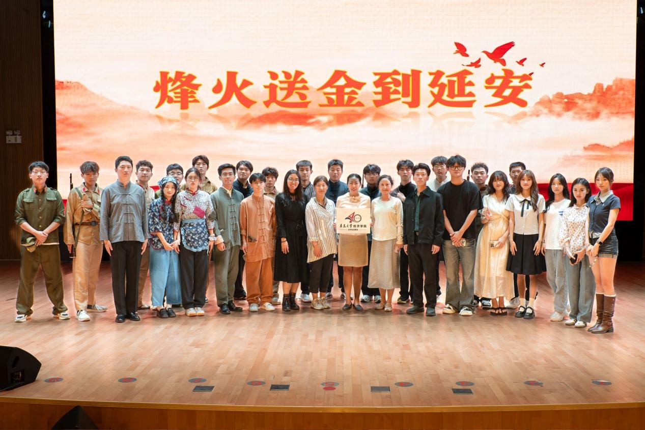 最后,师生共同观看了红色舞台剧《烽火送金到延安》。该剧讲述运金小分队突破重重封锁,向延安秘密运送黄金,支援党中央抗战的感人故事。演员们通过富有感染力的表演,生动再现“烽火送金”的峥嵘岁月。该剧不仅是一堂深刻的爱国主义教育课,也激励着2025级新生铭记历史、奋发向前。