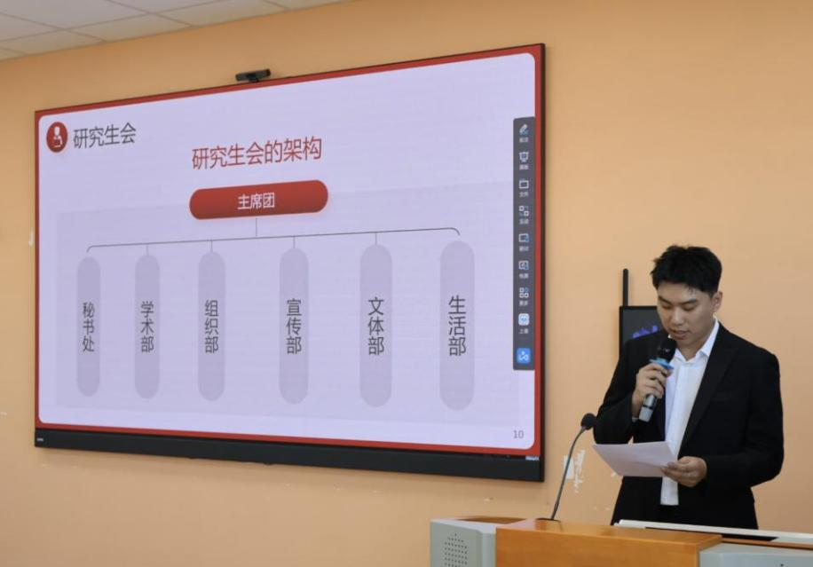 执行主席徐运成作研究生会工作报告,系统介绍了研会的部门构成与规章制度,同时围绕思想引领、组织建设及各部门工作任务展开未来规划,他坚定表示:“未来必将以高度的责任感与务实进取的精神,将各项计划落到实处,不辜负老师与同学们的期望,为服务同学成长与校园建设贡献坚实力量。”
