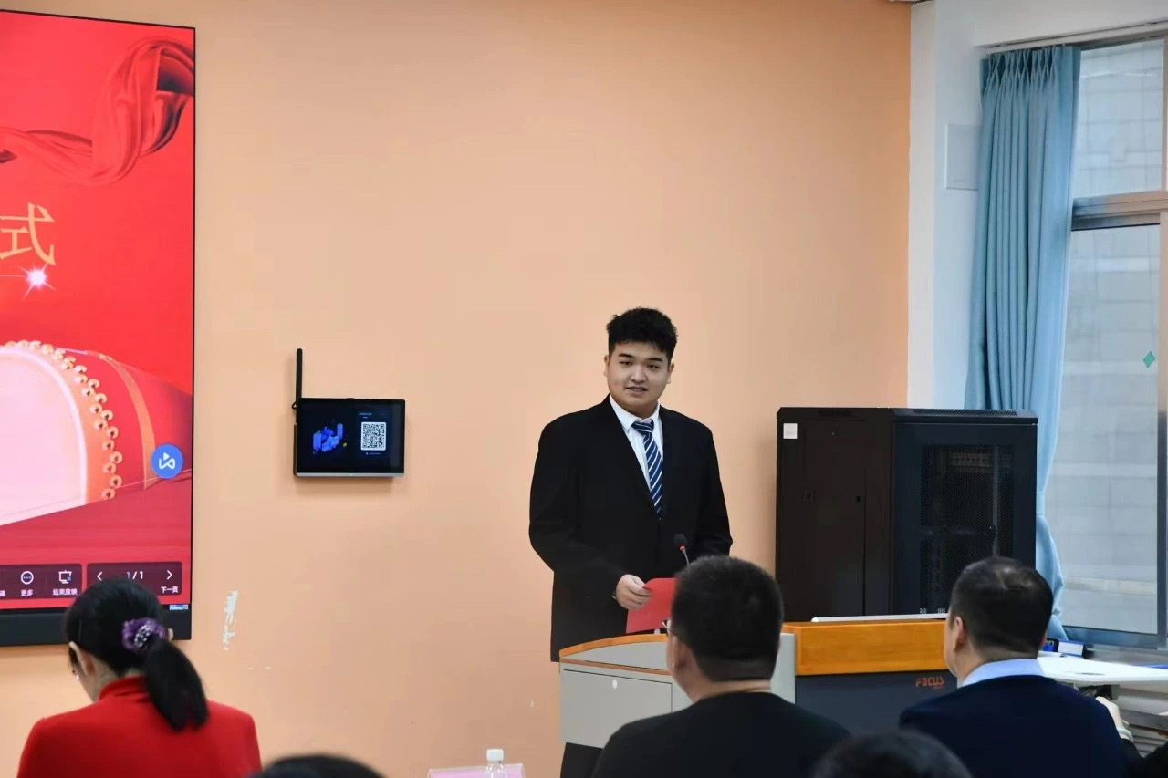 2022级国际经济与贸易专业隋子文作为获得奖学金的学生代表发言,向捐助企业表达感谢。他表示,奖助学金的发放不仅是一种奖励,更是对他的一种鞭策,他愿以德达志成领导为榜样,将来为母校、为院系做出力所能及的贡献。