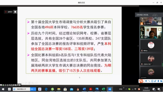 9月4日下午,国家社会科学基金重大项目首席专家孙玉环教授为全校师生200多人,在线上做了题为“‘市场调查与分析大赛’指导团队参赛经验分享”的高端讲座。